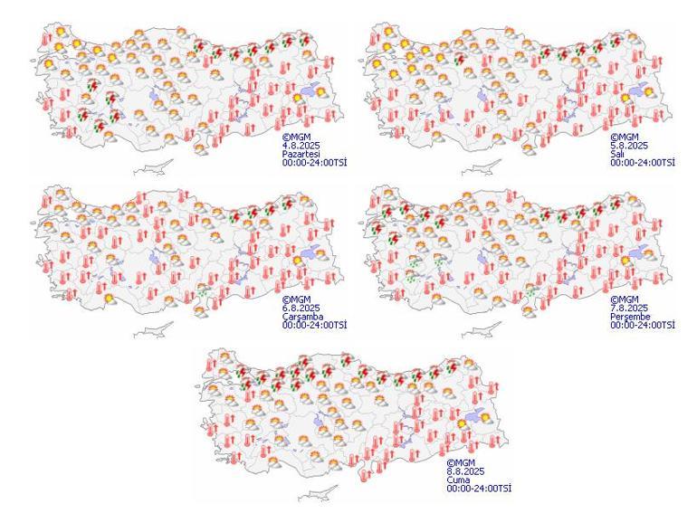 Hava Durumu: Parçalı ve az bulutlu; Rüzgar: Batı Akdeniz'de batı ve kuzeybatıdan, gece saatlerinden itibaren doğusu güneybatıdan 3 ila 5; Doğu Akdeniz'de batı ve güneybatıdan 3 ila 5, yarın (Pazartesi) öğle saatlerinde İskenderun körfezi 4 ila 6 kuvvetinde, Dalga: 1,0 ila 2,0 m; Görüş: İyi.