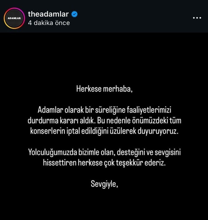 "Adamlar olarak bir süreliğine faaliyetlerimizi durdurma kararı aldık. Bu nedenle önümüzdeki tüm konserlerin iptal edildiğini üzülerek duyuruyoruz. Yolculuğumuzda bizimle olan, desteğini ve sevgisini hissettiren herkese çok teşekkür ederiz."