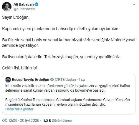“Sayın Erdoğan; kapsamlı eylem planlarından bahsedip milleti oyalamayı bırakın. Bu ülkede sanal bahis ve sanal kumar bizzat sizin verdiğiniz izinlerle yasal zeminde oynatılıyor. Bu lisansları iptal edin. Tek imzayla bugün, şu anda yapabilirsiniz. Çekin fişi, bitirin işi.”