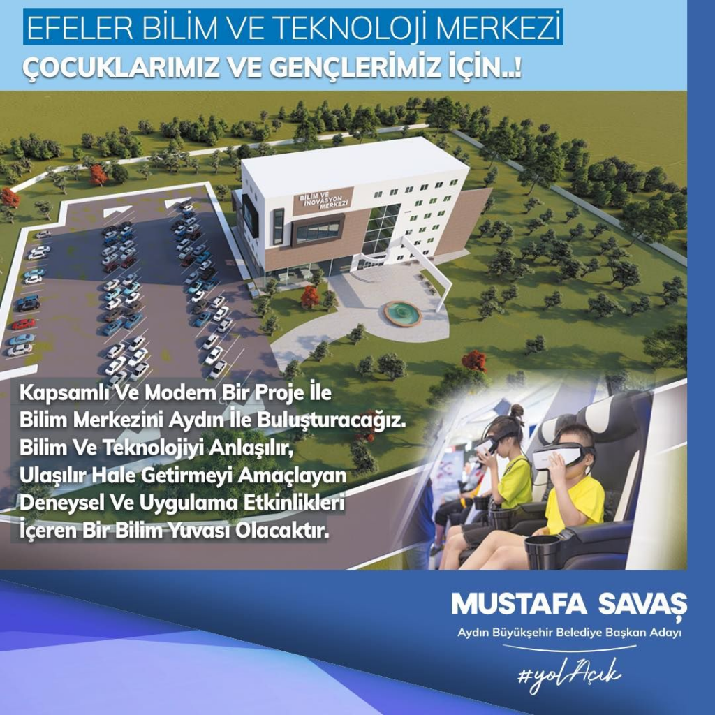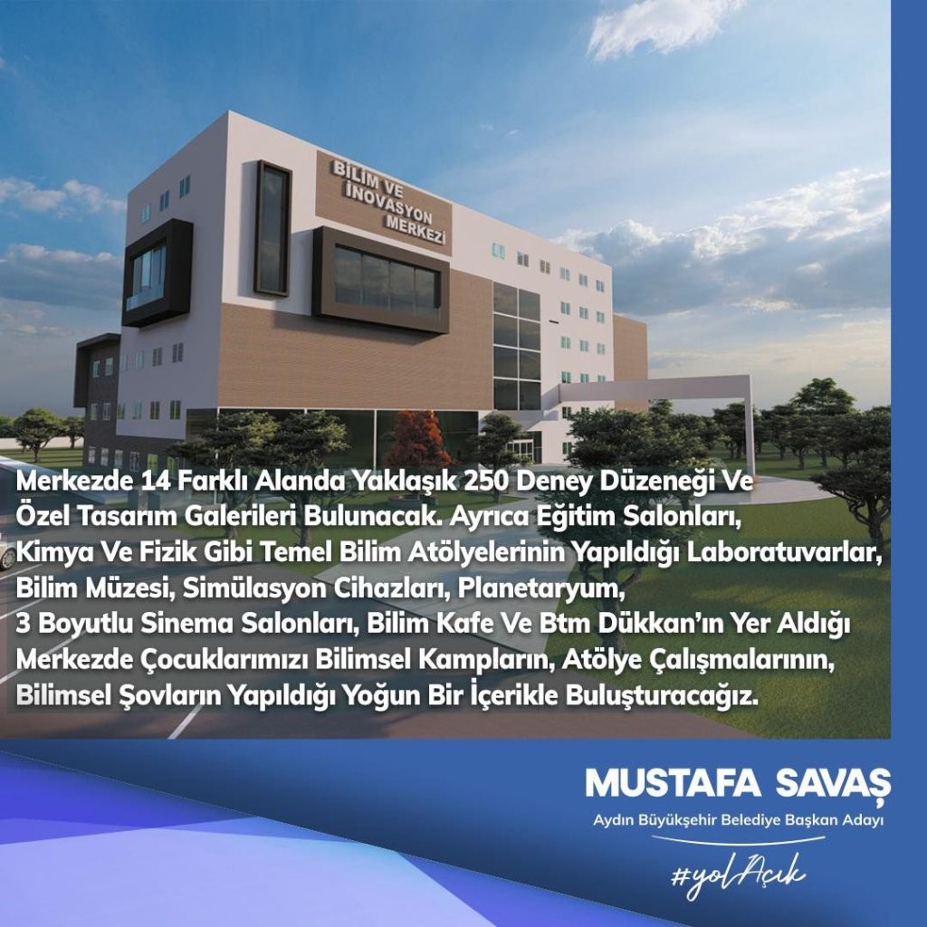 Hayata geçirecekleri Bilim ve Teknoloji Merkezi ile genç bilim sevdalarının yanlarında olacaklarını ifade eden Savaş, "Kapsamlı ve modern bir proje ile Bilim Merkezi’ni Aydın ile buluşturacağız. Bilim ve teknolojiyi anlaşılır, ulaşılır hale getirmeyi amaçlayan Bilim Merkezi, deneysel ve uygulama etkinlikleri içeren bir bilim yuvası olacaktır. Merkezimizde 14 farklı alanda yaklaşık 250 deney düzeneği ve özel tasarım galerisinin olması planlanmaktadır. Bunlara ek olarak eğitim salonları, kimya ve fizik gibi temel bilim atölyelerinin yapıldığı laboratuvarlar, bilim müzesi, simülasyon cihazları, planetaryum, üç boyutlu sinema salonları, bilim kafe ve BTM Dükkan’ın yer aldığı merkezde çocuklarımızı bilimsel kampların, atölye çalışmalarının, bilimsel şovların yapıldığı yoğun bir içerikle buluşturacağız" dedi.