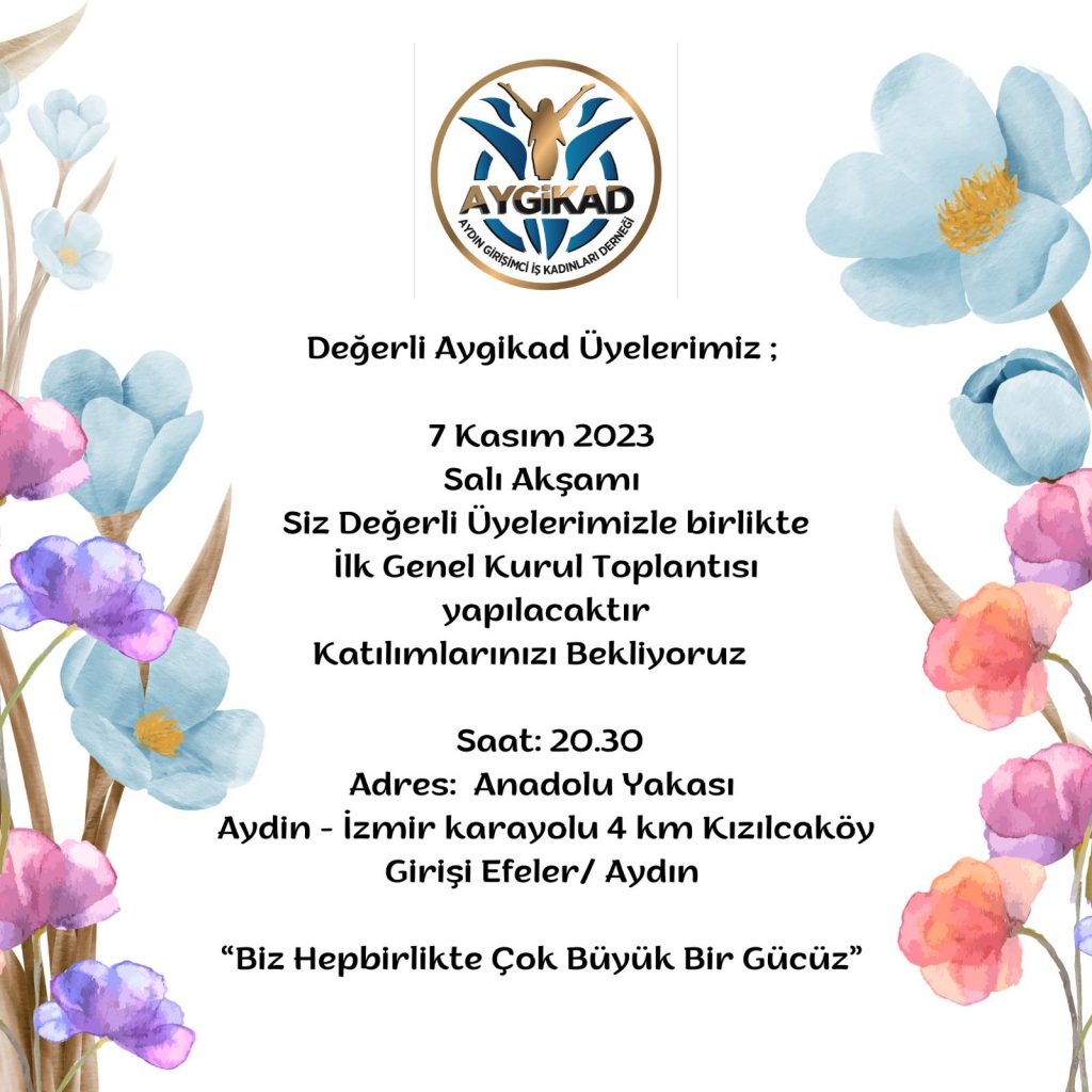 Aydın'da girişimci iş kadınların birleşmesi ile kurulan Aydın Girişimci İş Kadınları Derneği (AYGİKAD) başkanı Deniz Işık yapacakları ilk genel kurul için üyelerini davet etti. Başkan Işık, genel kurul toplantısının 7 Kasım Salı günü saat 20:30'da Kızılcaköy'de yapılacağını ve tüm üyelerini beklediklerinin altını çizdi.