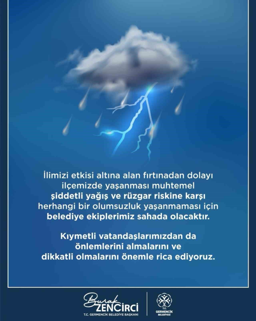 Germencik Belediye Başkanı Burak Zencirci, ilçe genelinde yaşanması muhtemel şiddetli yağış ve rüzgara karşı vatandaşları uyararak, dikkatli ve duyarlı olmalarını istedi.