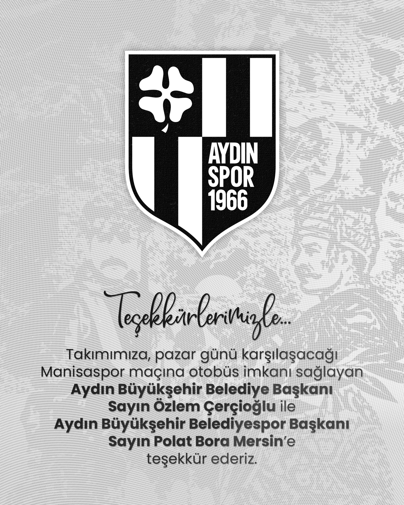 Yapılan açıklamada şu ifadelere yer verildi: “Takımımıza, pazar günü karşılaşacağı Manisaspor maçına otobüs imkanı sağlayan Aydın Büyükşehir Belediye Başkanı Sayın Özlem Çerçioğlu ile Aydın Büyükşehir Belediyespor Başkanı Sayın Polat Bora Mersin’e teşekkür ederiz.”
