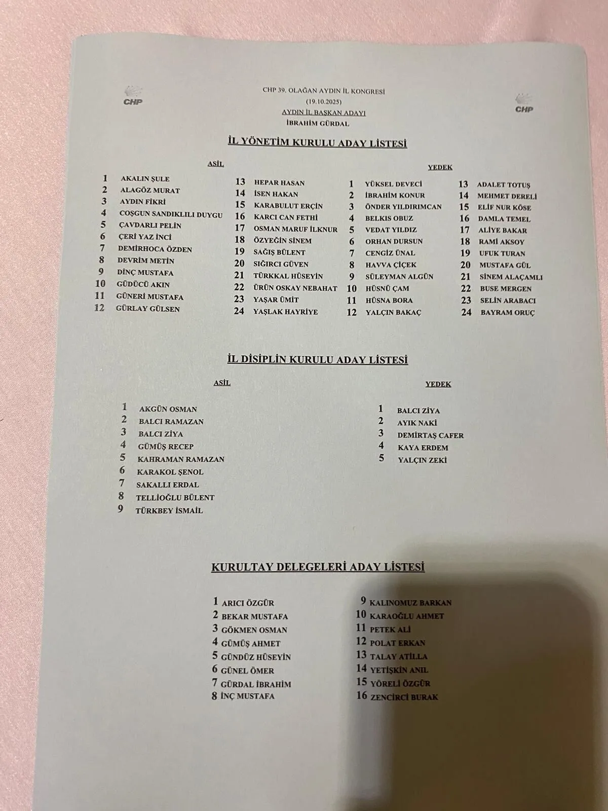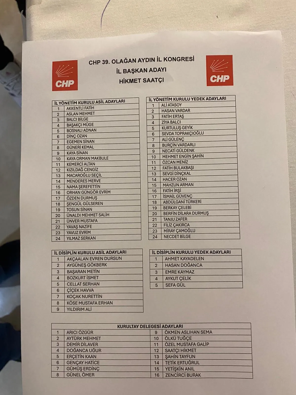 CHP Aydın 39. Olağan İl Kongresi’nde il başkan adaylarının yönetim kurulu, disiplin kurulu, ve delege listeleri duyuruldu.