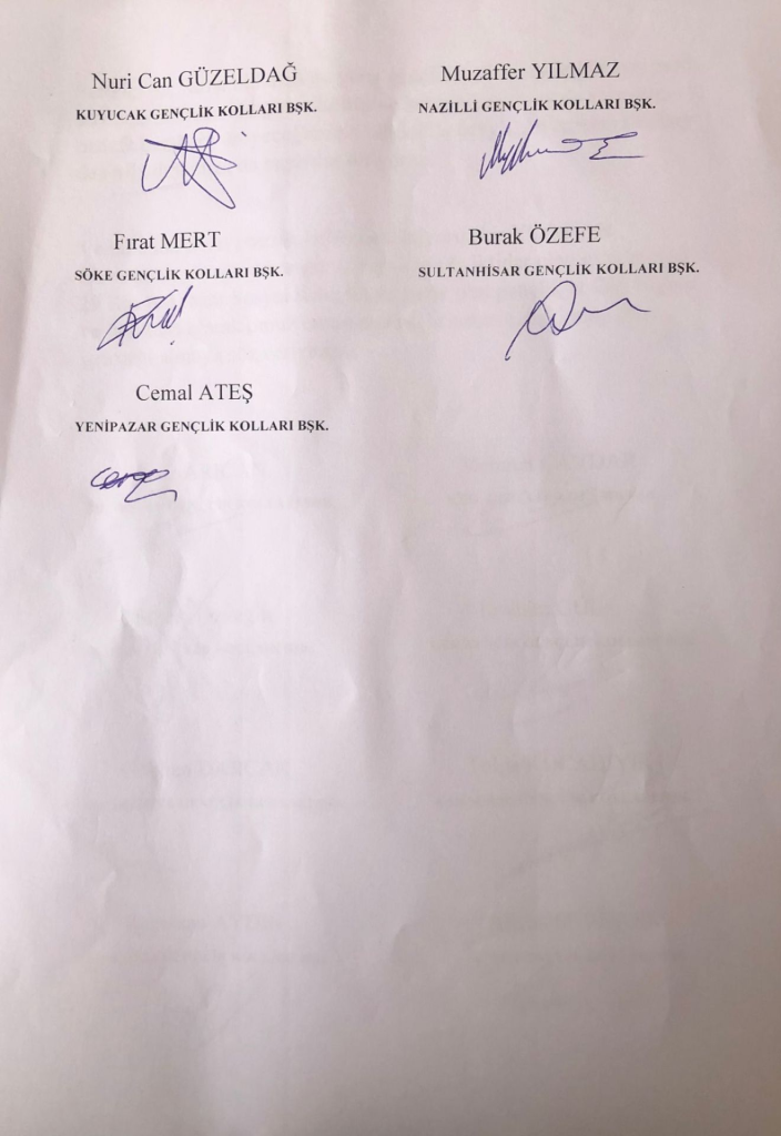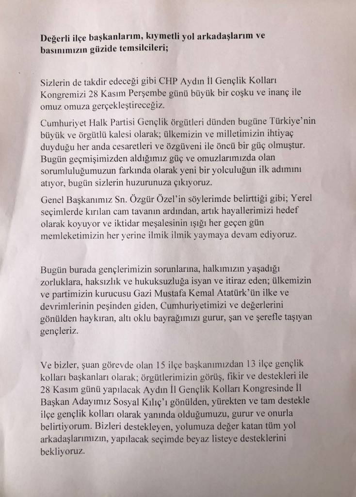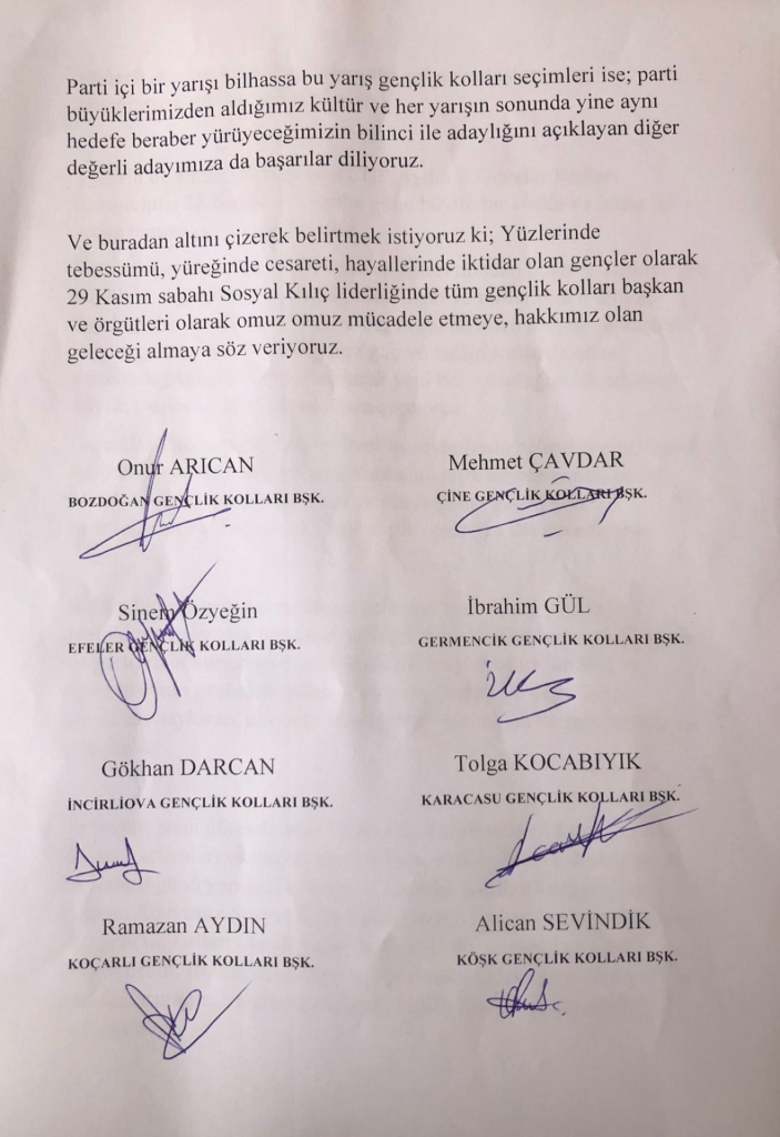 Ve bizler, şuan görevde olan 15 ilçe başkanımızdan 13 ilçe gençlik kolları başkanları olarak; örgütlerimizin görüş, fikir ve destekleri ile 28 Kasım günü yapılacak Aydın İl Gençlik Kolları Kongresinde İl Başkan Adayımız Sosyal Kılıç'ı gönülden, yürekten ve tam destekle ilçe gençlik kolları olarak yanında olduğumuzu, gurur ve onurla belirtiyorum. Bizleri destekleyen, yolumuza değer katan tüm yol arkadaşlarımızın, yapılacak seçimde beyaz listeye desteklerini bekliyoruz
