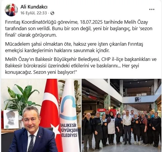 Yaşanan skandal sürecin ardından kendi sosyal medya hesabından bir paylaşım yapan CHP'li Ali Kundakçı, "Fırıntaş Koordinatörlüğü görevime, Melih Özay tarafından son verildi. Bunu bir son değil, yeni bir başlangıç, bir 'sezon finali' olarak görüyorum. Mücadelem şahsi olmaktan öte, haksız yere işten çıkarılan Fırıntaş emekçisi kardeşlerimin haklarını savunmak içindir. Melih Özay'ın Balıkesir Büyükşehir Belediyesi, CHP il ve ilçe başkanlıkları ve Balıkesir bürokrasisi üzerindeki etkilerini ve baskılarını, her şeyi konuşacağız. Sezon yeni başlıyor!" şeklinde bir paylaşım yaptı.