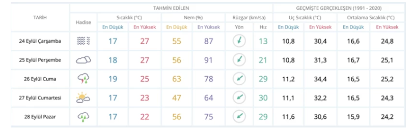 Daha önceki tahminlerde sadece 25 Eylül Perşembe günü yağış beklendiği duyurulmuştu. Ancak yapılan son değerlendirmelere göre, 26 Eylül Cuma günü gök gürültülü sağanak yağış, 28 Eylül Pazar günü ise sağanak yağışın etkili olacağı bildirildi. Cumartesi günü ise parçalı bulutlu bir hava bekleniyor.