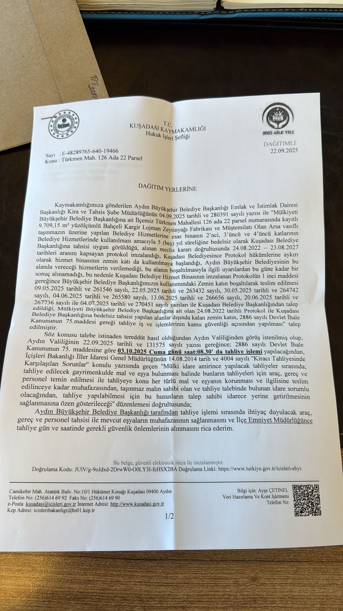 “Yalan” denilen tahliye kararı, Aydın Büyükşehir Belediyesi Emlak ve İstimlak Daire Başkanlığı Kira ve Tahsis Şube Müdürlüğü’nün 24.09.2025 tarihli yazısıyla Kuşadası Kaymakamlığı’ndan tahliye talebinde bulunduğunu gösteren resmi evraklarla ortadadır.
