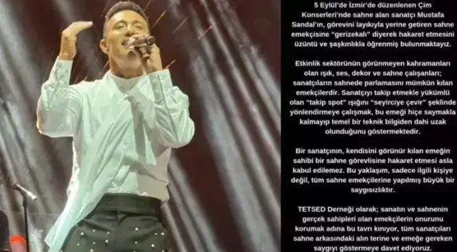 Dernek, sahne emekçilerine yönelik kullanılan dili eleştirerek, şu ifadeleri kullandı: "Etkinlik sektörünün görünmeyen kahramanları olan ışık, ses, dekor ve sahne çalışanları; sanatçıların sahnede parlamasını mümkün kılan emekçilerdir. Sanatçıyı takip etmekle yükümlü olan "Takip spot" ışığını "Seyirciye çevir" şeklinde yönlendirmeye çalışmak, bu emeği hiçe saymakla kalmayıp temel bir teknik bilgiden dahi uzak olunduğunu göstermektedir. Bir sanatçının, kendisini görünür kılan emeğin sahibi bir sahne görevlisine hakaret etmesi asla kabul edilemez. Bu yaklaşım, sadece ilgili kişiye değil, tüm sahne emekçilerine yapılmış büyük bir saygısızlıktır. TETSED Derneği olarak; sanatın ve sahnenin gerçek sahipleri olan emekçilerin onurunu korumak adına bu tavrı kınıyor, tüm sanatçıları sahne arkasındaki alın terine ve emeğe gereken saygıyı göstermeye davet ediyoruz."