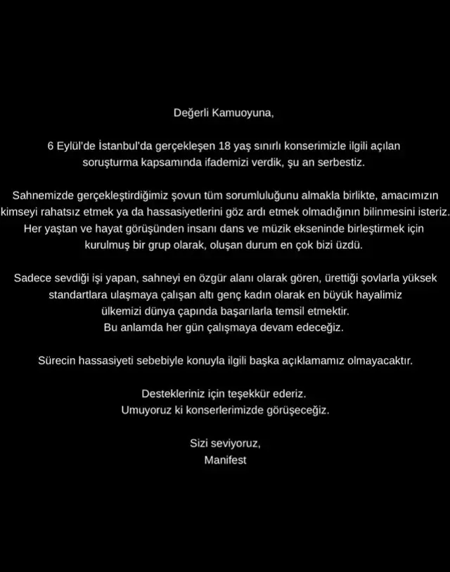 Sadece sevdiği işi yapan, sahneyi en özgür alanı olarak gören, ürettiği şovlarla yüksek standartlara ulaşmaya çalışan altı genç kadın olarak en büyük hayalimiz ülkemizi dünya çapında başarılarla temsil etmektir. Bu anlamda her gün çalışmaya devam edeceğiz. Sürecin hassasiyeti sebebiyle konuyla ilgili başka açıklamamız olmayacaktır. Destekleriniz için teşekkür ederiz. Umuyoruz ki konserlerimizde görüşeceğiz."