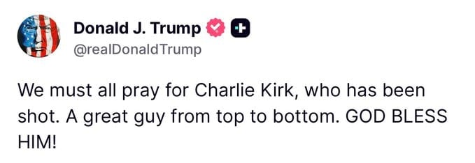 ABD Başkanı Donald Trump, "Charlie Kirk için hepimiz dua etmeliyiz. Baştan aşağı harika bir adam. Tanrı onu korusun" ifadelerini kullandı.