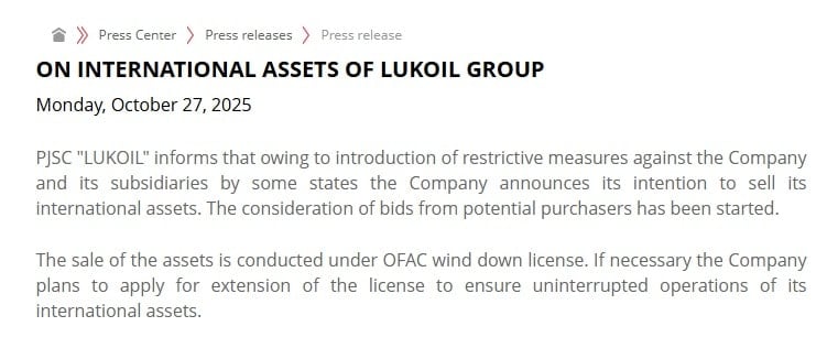 Şirketin internet sitesinden yayınlanan basın açıklamasında “Lukoil, uluslararası varlıklarını satma niyetini bildirmektedir. Potansiyel alıcıların tekliflerinin değerlendirilmesi süreci başladı” ifadelerine yer verildi.
